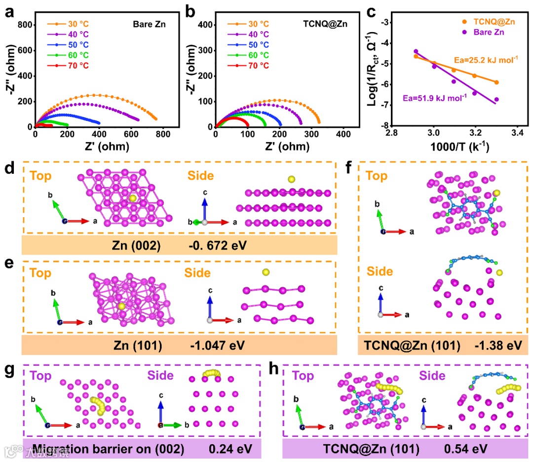 DFT理论计算结果表明,TCNQ@Zn(101)对Zn2+具有更强的结合能,并且其最佳吸附位点位于TCNQ@Zn两相界面之间。这表明TCNQ@Zn负极上的TCNQ2-可以将电解液中Zn2+泵取输送到Zn(101)表面。同时,相较于Zn(002),吸附锌原子在TCNQ@Zn(101)表面具有更高的迁移势垒。