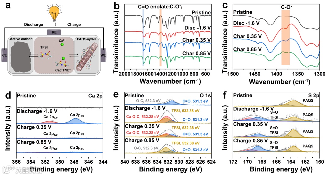 通过机理研究证明,Ca2+和CaTFSI+共同嵌入PAQS中,结合PAQS中羰基活性位点。此外,机理研究还证实了在高电位下TFSI-会可逆嵌入CNT中。最后,通过计算PAQS与Ca2+和CaTFSI+的结合能,进一步证明Ca2+和CaTFSI+更倾向于共同嵌入PAQS中。