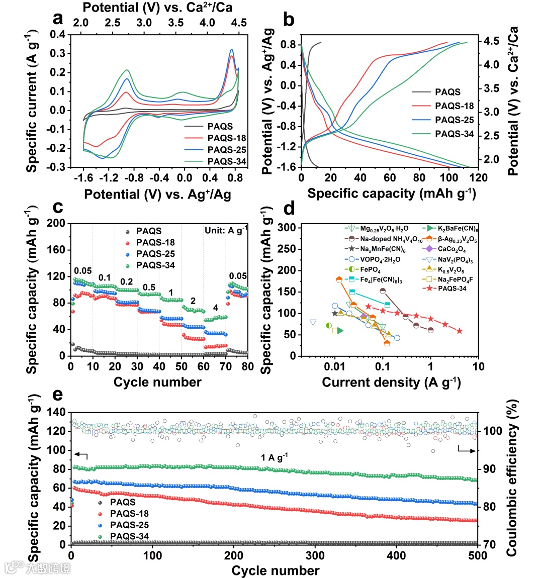 由于钙离子和主体晶格之间具有较强的静电相互作用,导致目前报道的大部分无机正极材料的倍率性能较差,仅能在电流密度0.1 A g-1以下运行。相比之下,PAQS-34展现出优越的倍率性能,超过了目前报道在非水系钙离子电池体系中的无机正极材料。PAQS-34电极在电流密度为0.05 A g-1时,展现出116 mAh g-1的比容量。
