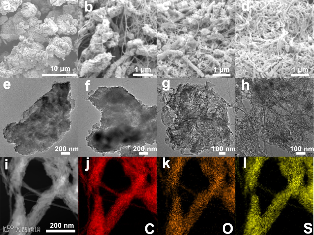 图2. 不同比例PAQS@CNT复合材料的形貌表征以及PAQS-34的元素分布。