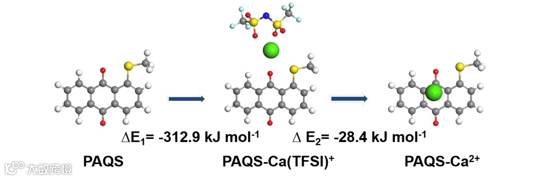 图5. 计算模拟PAQS与Ca2+和CaTFSI+的结合能。
