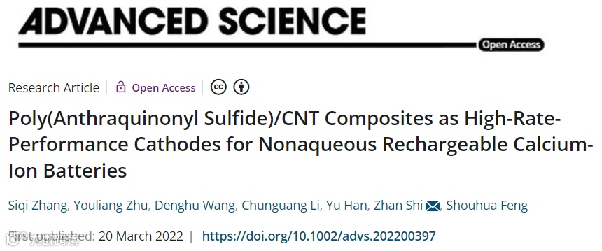 基于此,来自吉林大学的施展教授,在国际知名期刊Advanced Science上发表题为“Poly(Anthraquinonyl Sulfide)/CNT Composites as High-Rate-Performance Cathodes for Nonaqueous Rechargeable Calcium-Ion Batteries”的研究论文。