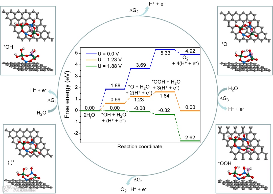 X-射线吸收精细结构表明催化剂中存在Ni-O-Fe结构,DFT计算发现吸附于该结构中镍和铁桥位的*OH具有适中的结合能,从而降低了整个OER反应过程的能垒。