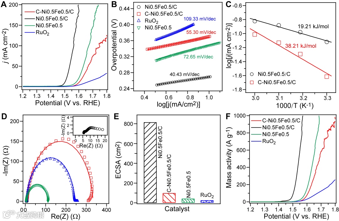 图2:电化学析氧性能 (A)极化曲线,(B)塔菲尔斜率,(C)活化能,(D)阻抗,(E)电化学活性面积,(F)质量活性