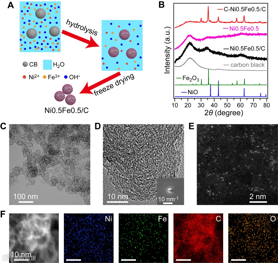 研究人员通过冷冻干燥的方法合成了分散于炭黑上的镍铁羟基氧化团簇。XRD和选区电子衍射的结果均表明该催化剂具有非晶的特征。同时,球差电镜的结果表明催化剂为团簇负载于碳黑上。