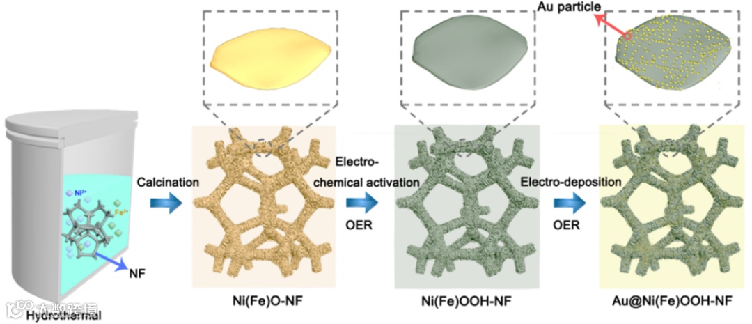 图1. Ni(Fe)OOH和Au@Ni(Fe)OOH催化剂的合成示意图