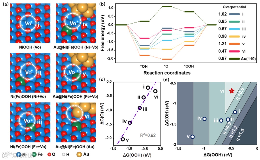 图5. (a)所有可能活性位点的结构模型。(b)OER反应吉布斯自由能计算。(c) ΔG(OOH)相对于ΔG(O)的比例关系。 (d)二维活火山图