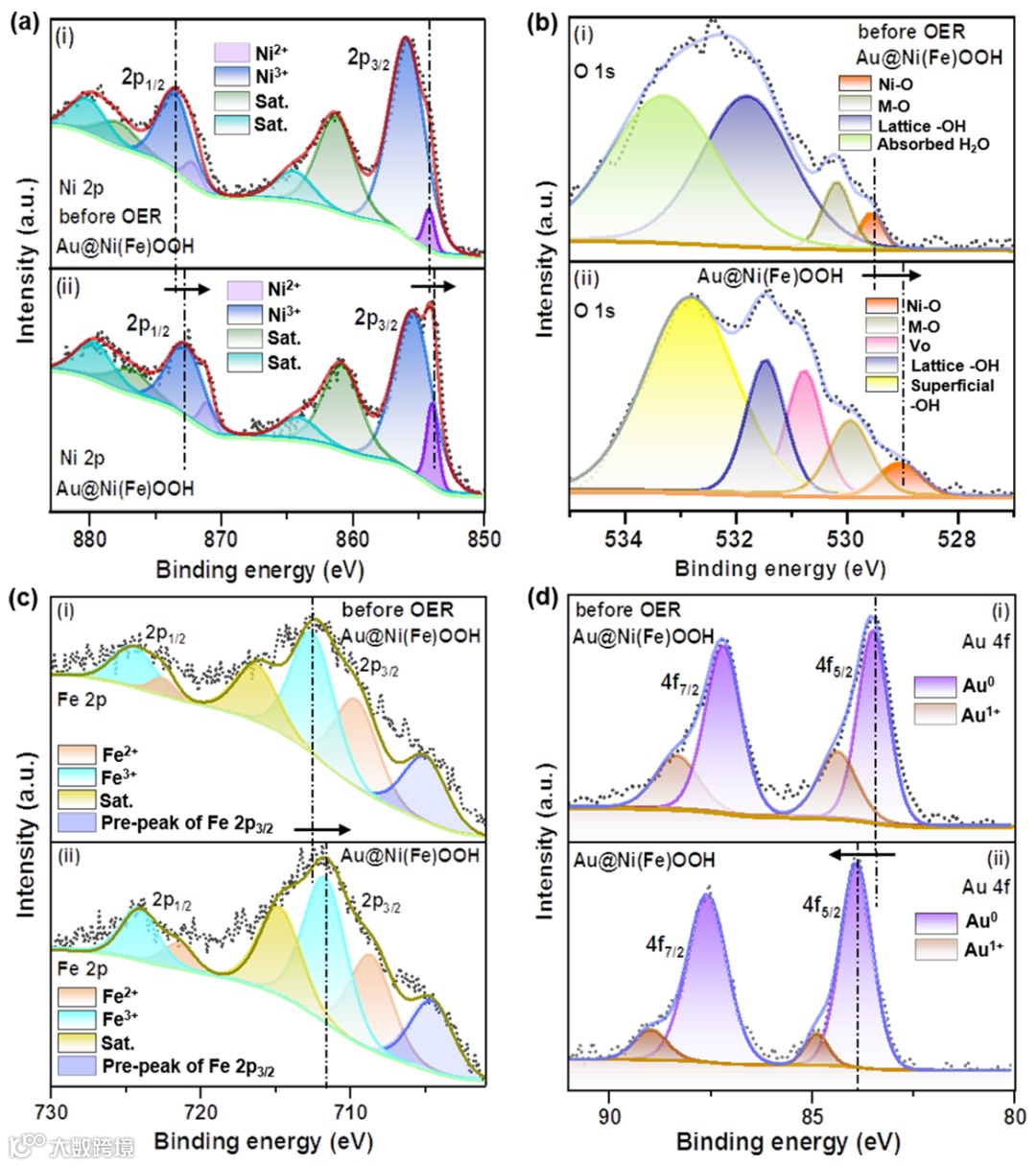 图4. OER反应前后Au@Ni(Fe)OOH样品中各元素的XPS图谱