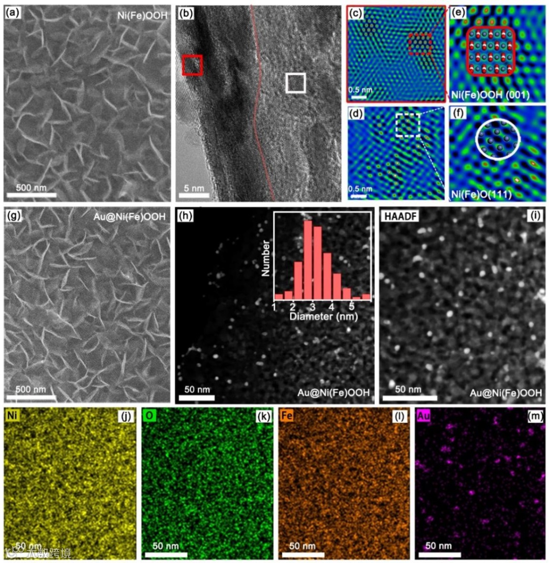图2. Ni(Fe)OOH的(a)SEM和(b)TEM图,(c)和(d)分别为(b)图相映位置的傅里叶变换滤波后的高分辨TEM图,(e)和(f)分别为(c)和(d)图相映位置的放大图。Au@Ni(Fe)OOH的(g)SEM和(h)TEM图谱,(h)插图为Au纳米颗粒的粒径分布。(i-m)为Au@Ni(Fe)OOH中Ni, O, Fe和Au的元素分布
