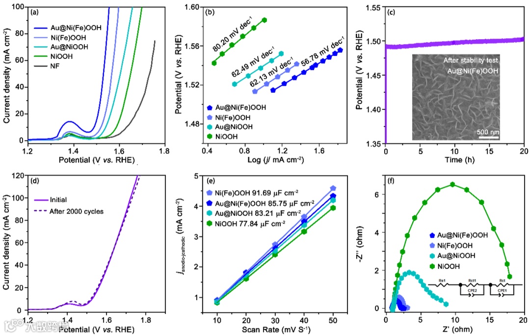 图3. (a) Au@Ni(Fe)OOH和参照样品的LSV极化曲线,(b)Tafel斜率,(c)稳定性测试,插图为稳定性测试后样品的SEM图谱。(d)样品经2000CV前后的LSV极化曲线,(e)双电层电容,(f)EIS图, 插图为相映的拟合电路