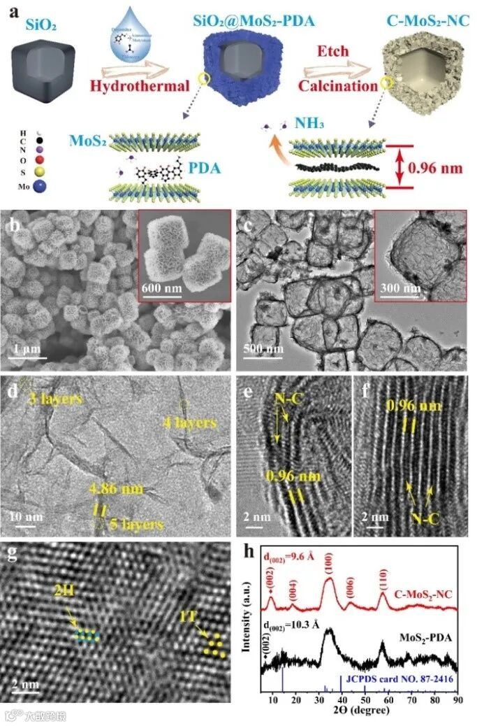 作者提出一种模板辅助湿化学法结合热解策略制备碳基序扩层MoS2纳米笼(C-MoS2-NC)。如图1a所示,以SiO2纳米盒为模板,以多巴胺(DA)为聚合剂,由于DA含有丰富的氨基和羟基官能团,可以紧紧吸附在SiO2纳米盒和对钼酸盐离子[Mo7O24]6+周围。