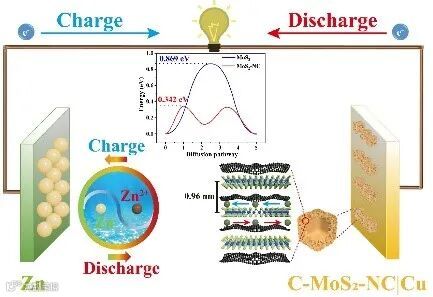 采用密度泛函理论(DFT)计算评估电极反应中Zn2+的插层行为。为了模拟Zn在MoS2-NC中的扩散,作者设置了6个扩散位点作为Zn在中间层中的扩散路径。在模拟过程中,随着移动位置的变化,对初始状态和最终状态进行了优化,MoS2的层间距明显扩大,这与实际情况相吻合。为了比较,我们计算了Zn在2H-MoS2和MoS2-C中的扩散势垒变化(图4b)。Zn在MoS2-NC中扩散能垒最低,为0.342 eV,仅为在纯MoS2 (0.869 eV)中扩散能垒的39.36%,也低于MoS2-C(0.384 eV),表明NC基序的引入显著降低了Zn的扩散能垒。