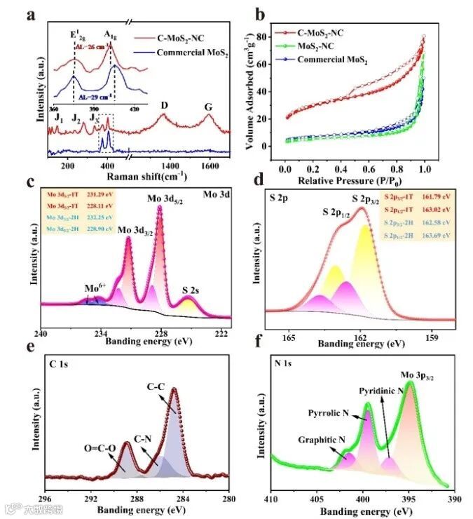 图2. (a) C-MoS2-NC和商业MoS2的Raman光谱, (b) C-MoS2-NC, MoS2-NC,和商业MoS2的氮气吸附-脱附曲线, (c-f) Mo 3d, S 2p, C 1s N1s的XPS.