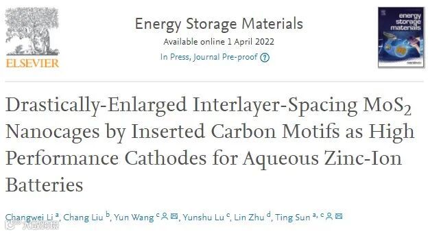 在这里,来自东北大学的孙挺教授团队在国际知名期刊Energy Storage Materials上发表题为“Drastically-Enlarged Interlayer-Spacing MoS2 Nanocages by Inserted Carbon Motifs as High Performance Cathodes for Aqueous Zinc-Ion Batteries”的研究工作。