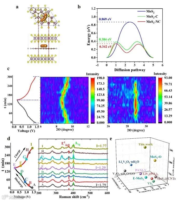 图4. (a)Zn在MoS2-NC模型中的扩散路径演示. (b)Zn在MoS2-NC, MoS2-C and MoS2三种模型中的扩散势垒. 在充放电过程中C-MoS2-NC的结构演化: 原位XRD衍射图样(c)和准原位Raman图谱(d). (e) C-MoS2-NC与其它以报道材料的循环性能的对比.