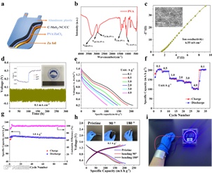 图5. (a)柔性全固态电池的结构演示. (b)PVA水凝胶的红外图谱. (c)PVA电解质的交流阻抗谱(0.01 Hz到10 kHz). (d)使用 PVA/ZnCl2 水凝胶作为电解质,在 0.1 mA cm-2下进行Zn电沉积/电解(电镀/剥离时间为 0.5 h)。左侧插图显示了第 1、100和 200次循环的放大电压曲线,右侧插图是PVA/ZnCl2水凝胶电解质的数码照片. (e)从 0.1 到 4.0 A g-1的放电曲线. 全固态电池的倍率性能(f)和循环性能(1.0 A g-1, (g)). (h)全固态电池在不同弯曲条件下的充放电曲线. (i)可穿戴串联电池为 LED 阵列供电的数码照片.