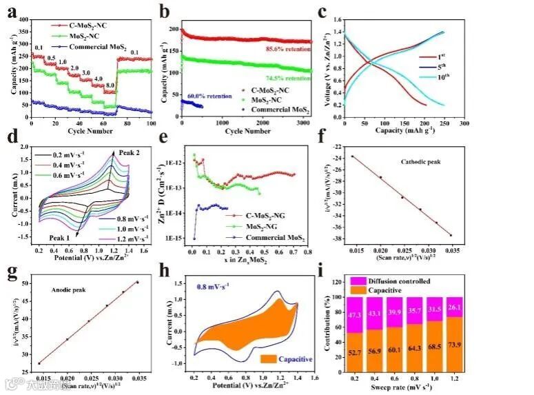 图 3. C-MoS2-NC, MoS2-NC和MoS2倍率性能对比(a)以及在1.0 A g-1下的循环性能对比(b). 在0.1 A g-1下C-MoS2-NC电极的恒流充电/放电曲线(c)以及不同扫描速率下的CV曲线(d). (e) 依据GITT测试计算得到Zn2+在三种不同材料中的离子扩散速率. 依据CV曲线获得的阴极峰(f)和阳极峰(g)的线性拟合.(h)在扫速为0.8 mV s-1时的赝电容贡献(阴影区域).(i) C-MoS2-NC电极在不同扫速下的赝电容贡献比.