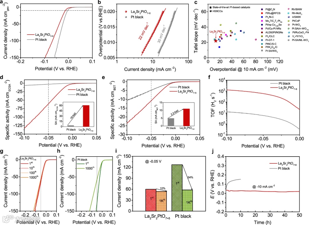 得益于该协同催化机制,La2Sr2PtO7+δ仅需13 mV 的低过电位便可提供10 mA cm-2的电流密度,塔菲尔斜率仅为22 mV dec-1。相较于商业铂黑催化剂,La2Sr2PtO7+δ展现出更高的本征活性和稳定性。