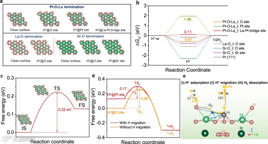 图4. La2Sr2PtO7+δ中多功能位点间原子尺度氢溢流过程的理论计算结果