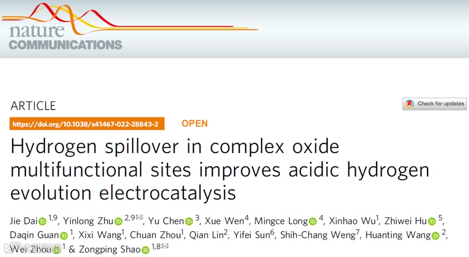 本文中,来自南京工业大学的邵宗平教授与澳大利亚莫纳什大学的朱印龙研究员合作,在国际知名期刊Nature Communications上发表题为“Hydrogen spillover in complex oxide multifunctional sites improves acidic hydrogen evolution electrocatalysis”的研究文章。