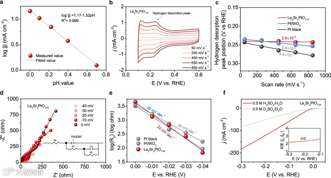 为证实La2Sr2PtO7+δ中可能存在氢溢流,我们开展了全面的电化学表征:pH依赖性、原位电化学氢吸脱附动力学、原位电化学阻抗谱以及H/D动力学同位素效应。以上的实验结果均佐证La2Sr2PtO7+δ催化剂存在氢溢流的可能性。