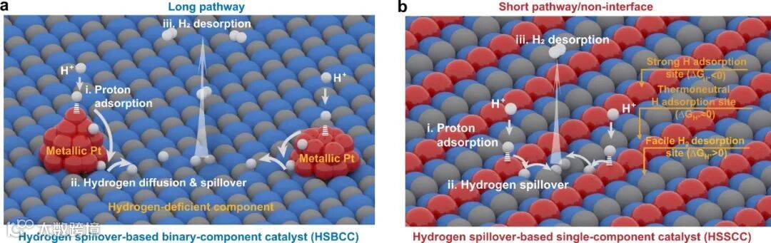 图1. 基于氢溢流的 (a) Pt/载体双组分催化体系(HSBCC)和(b) 单组分催化剂体系(HSSCC)析氢过程示意图