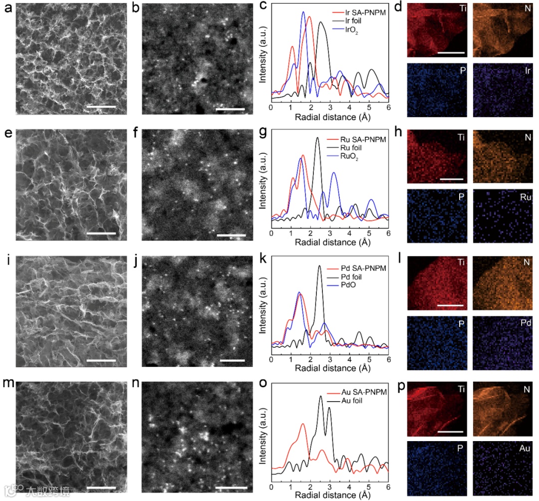 图3. M1 SA-PNPM的表征(M1 = Ir、Ru、Pd 和 Au)。(a) Ir SA-PNPM、(e) Ru SA-PNPM、(i) Pd SAPNPM、(m) Au SA-PNPM的SEM图像。(b) Ir SA-PNPM、(f) Ru SA-PNPM、(j) Pd SA-PNPM、(n) Au SA-PNPM的 HAADF-STEM图像。(c) Ir SA-PNPM, (g) Ru SA-PNPM, (k) Pd SA-PNPM, (o) Au SA-PNPM的FT-EXAFS光谱。(d) Ir SA-PNPM, (h) Ru SA-PNPM,(l) Pd SA-PNPM, (p) Au SA-PNPM的STEM-EDX元素映射图。