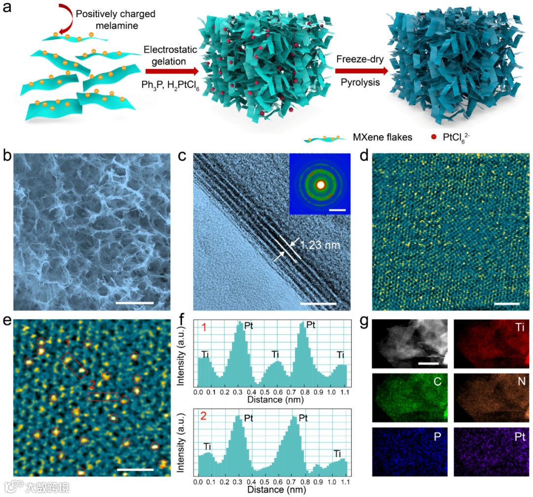 二维MXene已经通过空位还原和异原子桥接等各种方法用来锚定单原子位点。然而,在三维多孔MXenes锚定单原子位点以进一步增加催化活性位点,从而构建具有高活性和稳定性的电催化剂还尚未探索。在这里,我们报导了单金属位点修饰的三维多孔氮磷双掺杂Ti3C2TX纳米片的通用合成策略。通过“凝胶和热解”过程,我们合成了一系列原子级分散的金属催化剂(Pt、Ir、Ru、Pd 和 Au)。氮磷双配位的金属单原子具有独特的电子和几何结构,可以显著优化催化中间体的吸附能。同时三维多孔结构可以有效暴露活性位点并且促进质荷传输。因此,我们合成的Pt单原子修饰的三维多孔氮磷双掺杂Ti3C2TX纳米催化剂在酸性和碱性条件下显示出比商业铂碳催化剂高20倍的电催化析氢活性。