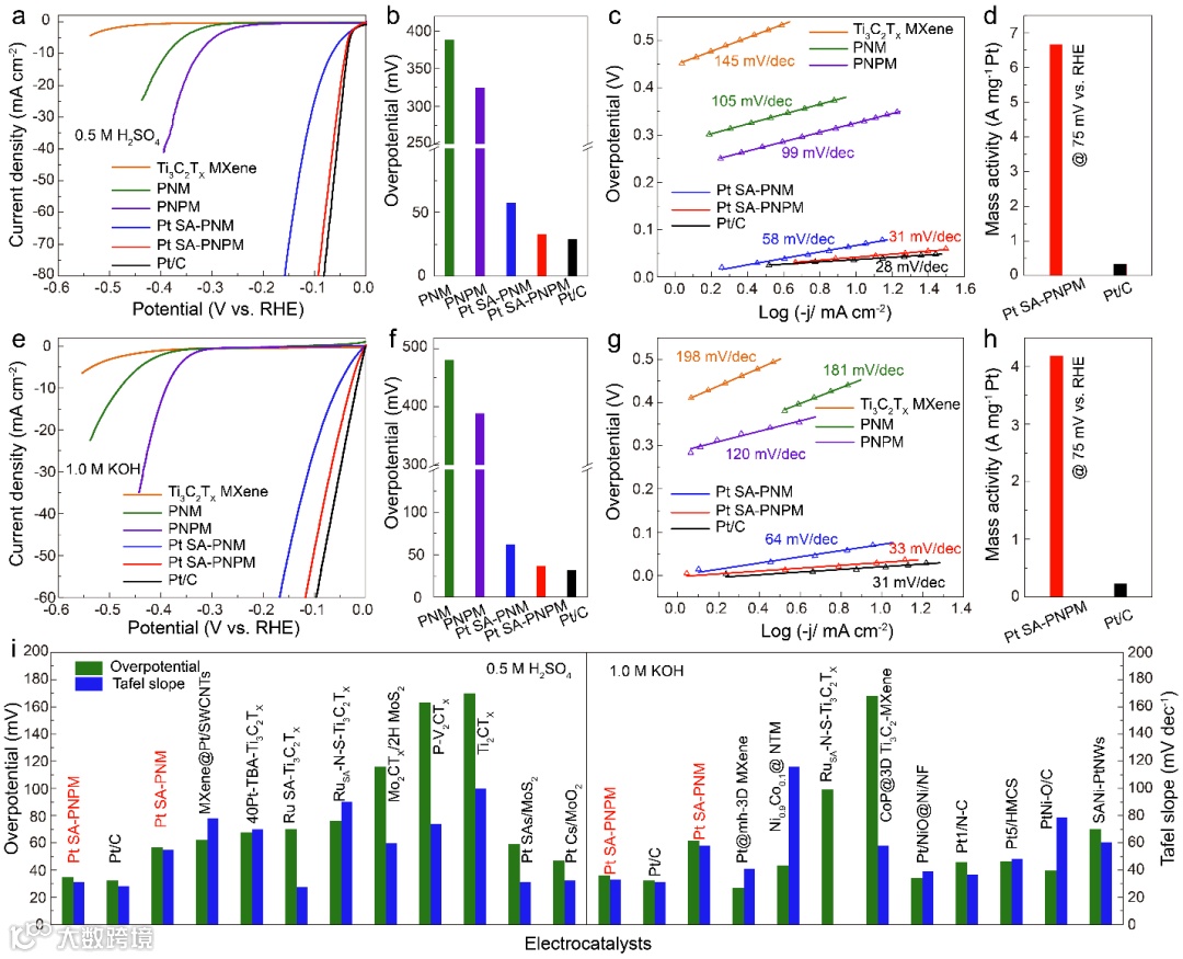 图4. 电化学HER性能。Ti3C2TX MXene、PNM、PNPM、Pt SA-PNM、Pt SA-PNPM和商业Pt/C在0.5M H2SO4中的 (a) 极化曲线, (b) 过电位和 (c) Tafel图。(d) Pt SA-PNPM和商业Pt/C (20 wt%) 在0.5 M H2SO4中的 HER质量活性比较图。Ti3C2TX MXene、PNM、PNPM、Pt SA-PNM、Pt SA-PNPM和商业Pt/C在1M KOH中的 (e) 极化曲线、 (f) 过电位和(g) Tafel 图。(h) Pt SA-PNPM 和商业Pt/C (20 wt%) 在1 M KOH 中的质量活性比较图。(i) 催化活性(过电势)和催化动力学(Tafel 斜率)的比较图。