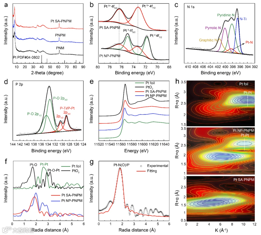 图2. 化学态和局部配位环境表征。(a) PNM、PNPM 和Pt SA-PNPM的XRD图。(b) Pt SA-PNPM和Pt NP-PNPM 的Pt 4f 轨道的XPS光谱。(c) Pt SA-PNPM的 N 1s 轨道的XPS光谱。(d) Pt SA-PNPM的P 2p 轨道的XPS光谱。(e)PtO2、Pt 箔、Pt SA-PNPM和Pt NP-PNPM的XANES光谱。(f)PtO2、Pt 箔、Pt SA-PNPM 和 Pt NP-PNPM FT-EXAFS光谱。(g) Pt SA-PNPM的FT-EXAFS拟合结果。(h) Pt SA-PNPM、Pt NP-PNPM 和 Pt 箔的EXAFS光谱的小波变换图。