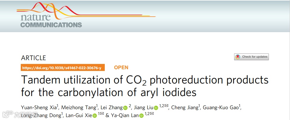 本文中,南京师范大学/华南师范大学兰亚乾教授、刘江教授和谢兰贵教授合作,首先利用MOF基晶态材料作为光催化剂实现CO2到CO的光催化定向转化,进一步设计兼容的反应体系和反应装置,成功实现了光催化还原CO2反应和羰基化反应的串联催化反应体系。