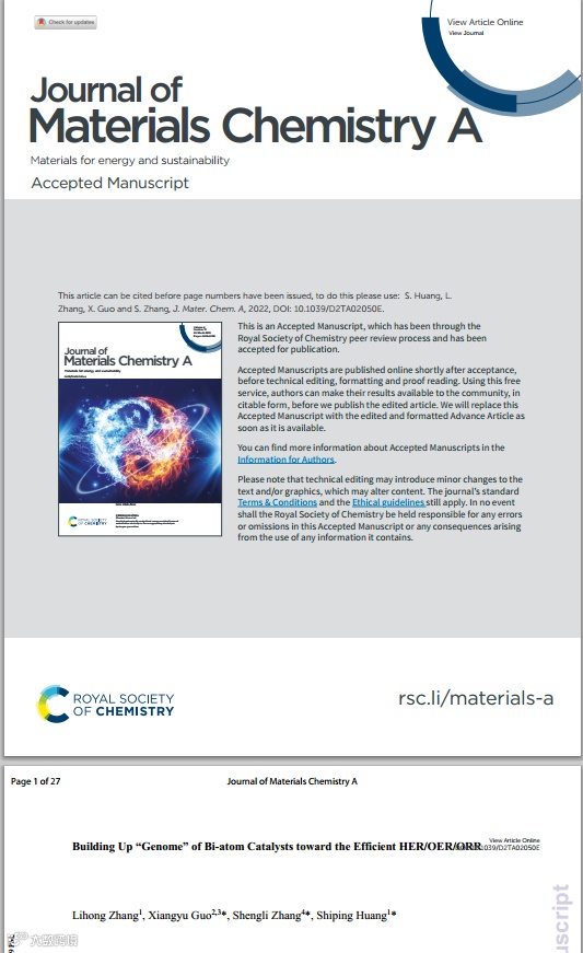 基于此,来自北京化工大学的黄世萍教授与北京科学研究中心的郭翔宇老师与南京理工大学的张胜利教授合作,在知名期刊Journal of Materials Chemistry A上发表题为“Building Up “Genome” of Bi-atom Catalysts toward the Efficient HER/OER/ORR”的文章。