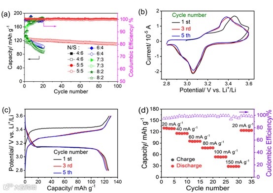 图 4 (a)LiTCNQ ||NSC(N/S=4:6,5:5,6:4,7:3,8:2) ||Li电池的循环性能;(b)Li ||NSC || LiTCNQ (N/S=5:5)电池的典型循环伏安(CV)曲线;(c) Li ||NSC || LiTCNQ (N/S=5:5)电池充放电曲线和(d)倍率性能。