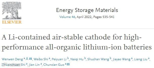基于此,来自苏州科技大学的邓雯雯副教授和郭春显教授,在国际知名期刊Energy Storage Materials上发表的题为“A Li-contained Air-Stable Cathode for High-Performance All-Organic Lithium-ion Batteries”的研究论文。
