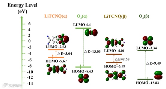 图 2 LiTCNQ和O2分子α电子和β电子的HOMO/LUMO空间分布、能量、能隙(ΔE)分布