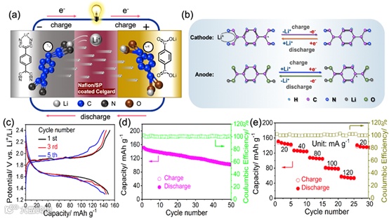 图 6 (a)Li2TPh||LiTCNQ阳离子摇椅全有机电池工作示意图;(b) 正极和负极的氧化还原反应方程式;Li2TPh||LiTCNQ全电池的典型充电/放电曲线(c)、循环稳定性(d)和速率性能(e)曲线。
