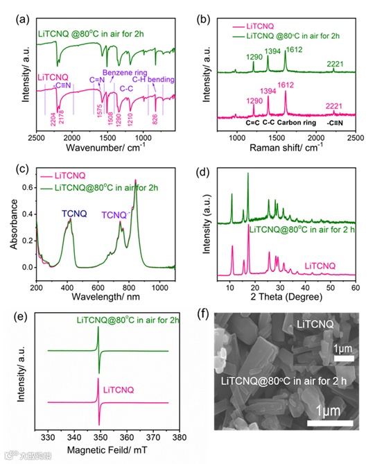图 3 未处理和80oC空气中加热2h后LiTCNQ粉末的红外(a)、拉曼(b)、紫外光谱(c)、XRD图谱(d)、电子顺磁共振(e)和扫描电镜图像(f)。