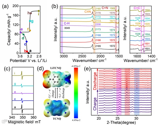 图 5 LiTCNQ正极的充电/放电曲线,其中曲线上的字母表示取样位置;不同充放电深度下LiTCNQ电极的红外光谱(b)和电子顺磁共振光谱(c);(d)计算的LiTCNQ和TCNQ分子的MESP分布;(e)LiTCNQ充放电第一圈的原位XRD图。