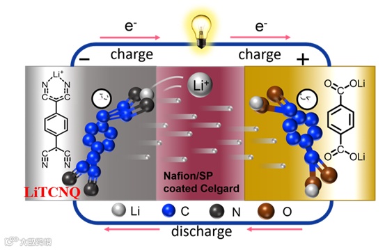 图1. Li2TPh||LiTCNQ阳离子摇椅全有机电池示意图