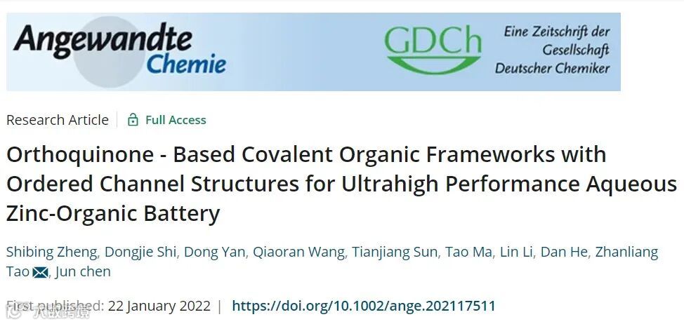 Shibing Zheng, Dongjie Shi, Dong Yan, Qiaoran Wang, Tianjiang Sun, Tao Ma, Lin Li, Dan He, Zhanliang Tao*, Jun chen. Orthoquinone - Based Covalent Organic Frameworks with Ordered Channel Structures for Ultrahigh Performance Aqueous Zinc-Organic Battery. Angew. Chem. Int. Ed.