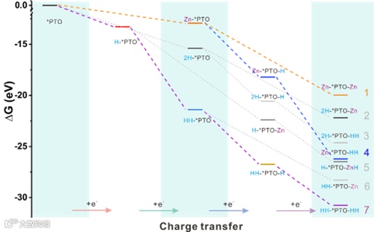 图5. 反应单元 *PTO 与相关放电状态分子之间的吉布斯自由能隙 (ΔG)及放电过程反应路线。2H-*PTO-Zn 表示两个 H+ 同时插入。