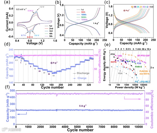图3. (a) 0.5 mV s-1下的CV曲线。(b) 1 A g-1 时的充放电曲线。(c)不同倍率下的充放电曲线和(d) 0.5 -85 A g-1 电流范围内的循环性能。(e) BT-PTO COF与RAZMBs典型有机阴极材料的 Ragone 图。(f) BT-PTO COF电极在 5 A g-1 的长循环稳定性。