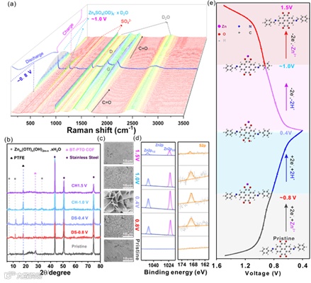 图6. (a) 3 M ZnSO4 中 BT-PTO - COF的原位拉曼光谱。3M Zn(CF3SO3)2 中BT-PTO COF 的(b)非原位XRD,(c) SEM图像,(d)不同状态下的XPS光谱和(e) H+, Zn2+ 共嵌入过程