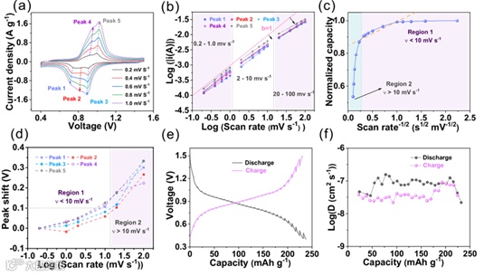 图4 . (a) BT-PTO - COF 在 0.2 ~ 1 mv s-1 范围内的CV曲线。(b)在扫描速率 0.2 -100 mV s-1时,log(i) 和 log(v) 的关系。(c)在 0.2-100 mV s-1的扫描速率下归一化容量曲线。(d) 阴极峰值电位随扫描速率曲线的变化曲线。(e) 50 mA g-1电流密度下的充放电 GITT 曲线; (f) Zn2+的扩散系数。