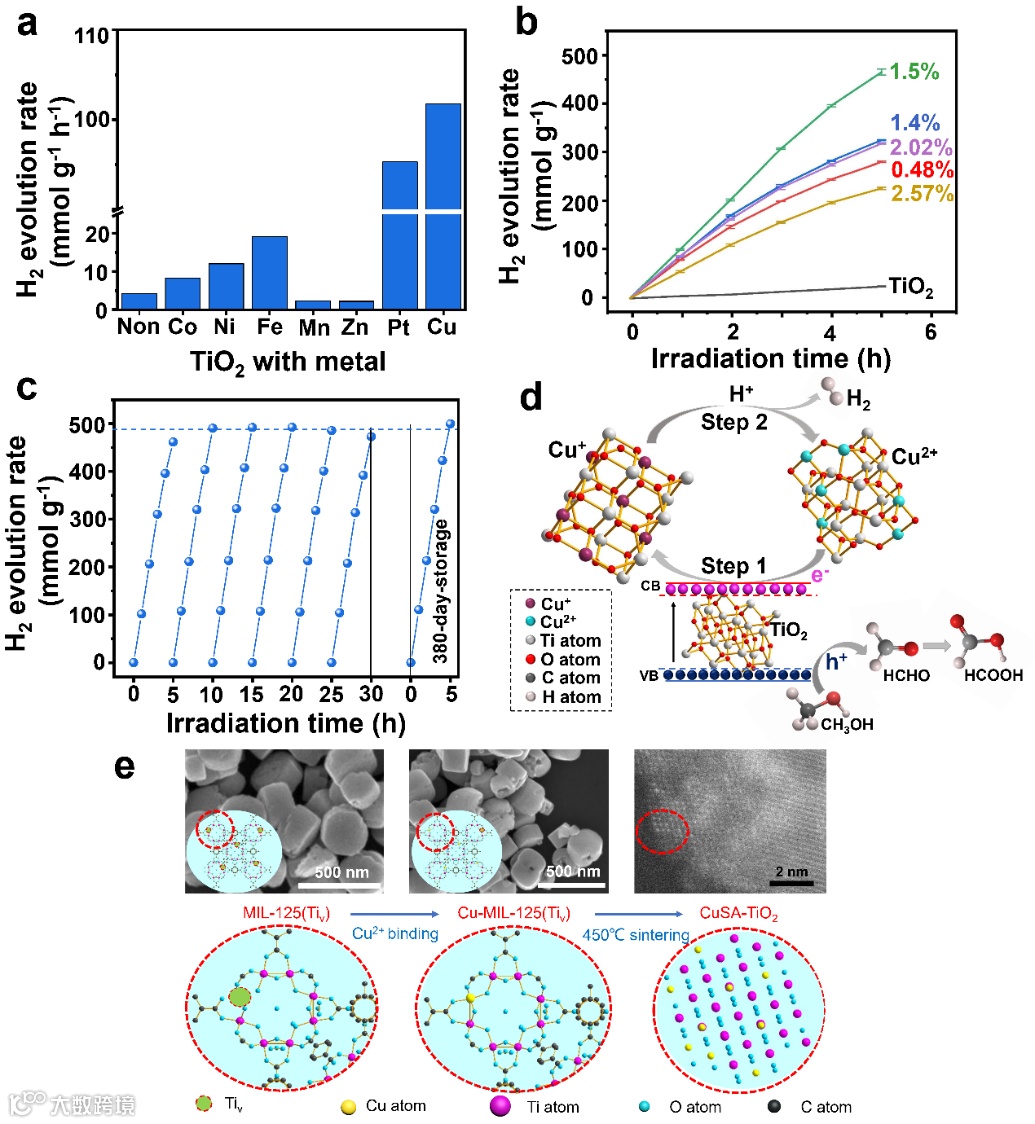 图2 (a)纯TiO2以及不同金属单原子负载TiO2的产氢率;(b)不同负载量的CuSA-TiO2 5小时的产氢量;(c)1.5% CuSA-TiO2产氢的循环稳定性和长期稳定性;(d)1.5% CuSA-TiO2的产氢机理示意图