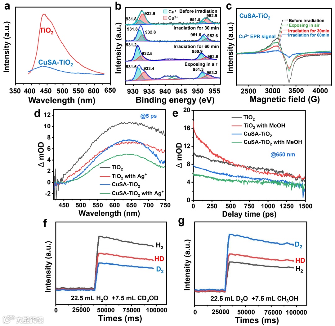 Fig. 4 (a) TiO2 和CuSA-TiO2 的PL光谱,激发波长 375 nm;(b) CuSA-TiO2的原位 Cu 2p XPS谱图;(c) CuSA-TiO2 的原位EPR谱图. (d) 在有、无 AgNO3 (2 mM)的条件下,TiO2 和 CuSA-TiO2 的TAS图谱;(e) 在有、无甲醇(10%) 的条件下,TiO2 和 CuSA-TiO2 的电荷衰减动力学;(f) H2O、CD3OD溶液中,CuSA-TiO2催化下H2、HD和 D2 的产生情况;(g) D2O、CH3OH溶液中,CuSA-TiO2催化下H2、HD和 D2 的产生情况。
