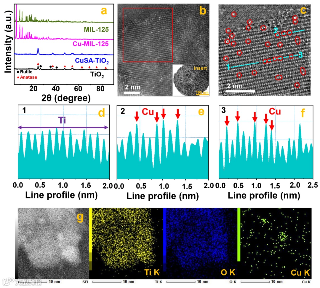 图3(a)MIL-125, Cu-MIL-125, TiO2, 和CuSA-TiO2的XRD图;(b-f)CuSA-TiO2的球差电镜图;(g)CuSA-TiO2 中Ti, O和 Cu的mapping图