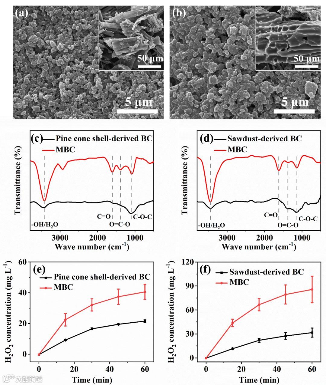 图4. 球磨前后松果壳和木屑生物炭结构和性能表征结构