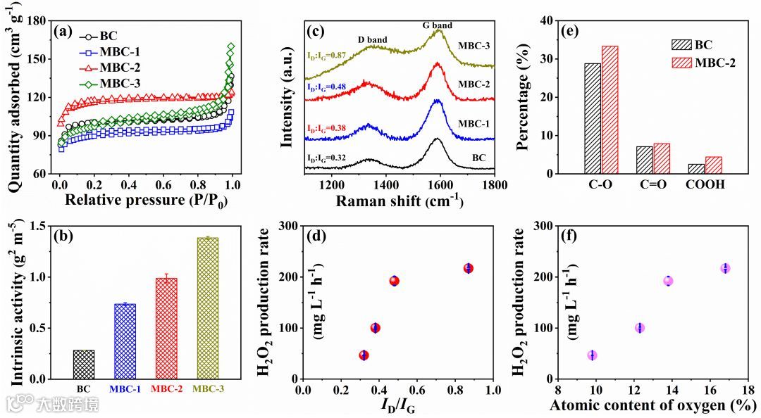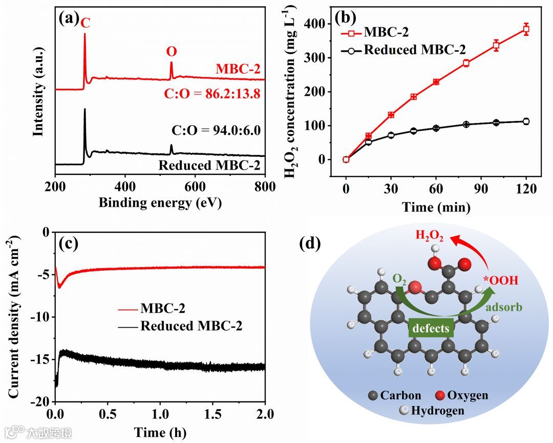 通过与热还原球磨生物炭的性能进行对比,进一步揭示了球磨对材料表面特性的调控机制,发现球磨引入的缺陷和含氧官能团可分别充当氧气吸附位点和ORR选择性调控位点促进H2O2电合成(图3)。
