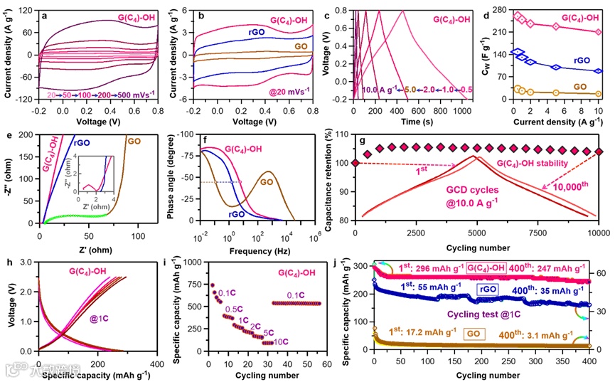 图 4 . 超级电容器的应用:(a) G(C4)-OH 分别在扫速为 20, 50, 100, 200, 和500mV s-1时的CV曲线; (b) G(C4)-OH, rGO 和GO在扫速为20mV s-1 下的CV曲线对比图; (c) G(C4)-OH 分别在电流密度为0.5, 1, 2, 5和10A g-1时的GCD曲线 (d) G(C4)-OH, rGO 和 GO在不同电流密度下的比容量对比图 ; (e) G(C4)-OH, rGO 和 GO的EIS阻抗图; (f) G(C4)-OH, rGO 和 GO的Bode图; (g) G(C4)-OH在电流密度为10A g-1时循环10000圈的循环稳定性图 ; 锂离子电池的应用:(h)G(C4)-OH 在电流密度为1C时的充放电曲线; (i)  G(C4)-OH 在电流密度从0.1C-10C-0.1C的倍率图; (j) G(C4)-OH, rGO 和GO 在电流密度为1C时400圈的循环稳定性对比图。